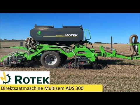 Multisem ADS 300 Direktsaatmaschine mit 18,75 cm Reihenabstand, 16 Einscheibenschare in Parallelogrammaufhängung, Saatandruckrolle, Schließrolle im Druck und Winkel verstellbar, Saatguttank 1320 l Düngertank 1080 l, pneumatische Dosierung, mechanisch angetriebenes Gebläse über Zapfwelle, Bodenradantrieb mit Stufenlos- Getriebe, elektronische Särohrüberwachung, Rotorüberwachung, Bereifung 500/45-22,5, Unterlenkeranhängung,