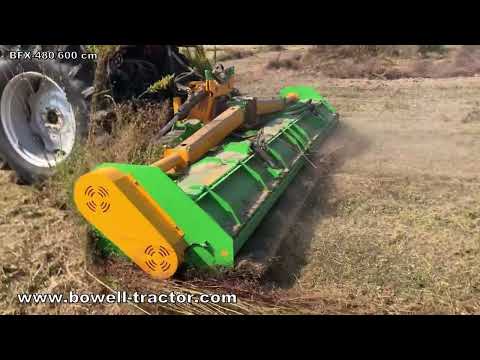 Die Bowell BFX-Mäher Serie ist mit einem sehr leistungsfähigen, zweiseitigen Winkelgetriebe des bekannten italienischen Herstellers CMR ausgestattet und kann so auch von großen Traktoren optimal als Flächenmulcher eingesetzt werden. BFX-480 und BFX-600 sind professionelle klappbarer Flächenmähwerke, die sowohl für die Bewirtschaftung der anspruchsvolleren Ernterückstände (Mais, Raps, Sorghum, Gras und Sonnenblumen) als auch für die Pflege von unbestellten Flächen konzipiert sind. Die BFX-Serie ist in zwei Arbeitsbreiten - 4,80 m und 6,00 m - erhältlich und für den Einsatz mit Traktoren im Leistungsbereich von 140 - 250 PS ausgelegt. Mit dem klappbaren Rahmen lässt sich das Gerät für den Straßenverkehr innerhalb weniger Sekunden auf eine Breite von 220 cm zusammenklappen.